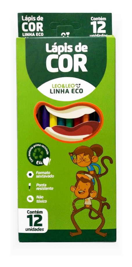 O Lápis de Cores Eco Leo & Leo é feito de matéria prima reciclada, que respeita o meio ambiente e reutiliza resinas e pigmentos. A caixa possui 12 cores, mina macia e resistente, corpo de resinas escuras e formato sextavado.