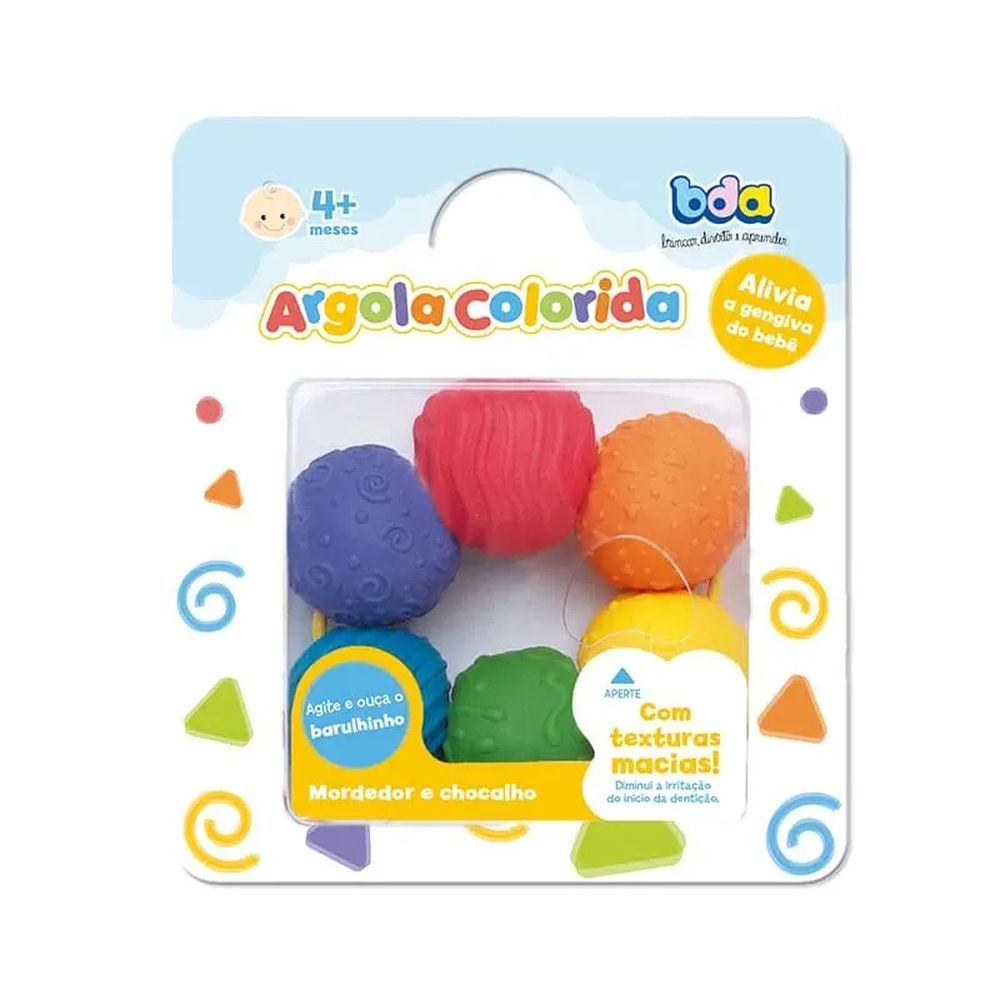 Mordedor em formato de argola com seis bolinhas coloridas e texturizadas. São fáceis de segurar e gostosas de morder!