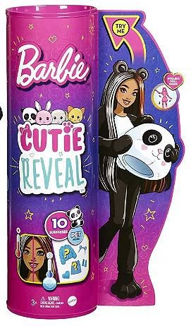 Com a Boneca Barbeie Cutie Reveal você vai se divertir muito, são 10 acessórios surpresas para você revelar. Abra a embalagem e uma linda Panda vai aparecer para você se divertir. Remova sua fantasia para encontrar uma linda boneca Barbie com cabelos longos e com detalhes incríveis. Cada pacotinho surpresa você pode encontrar roupas brilhantes, sapatos, tiara, pente e outros acessórios, e ainda inclui um mini pandinha super fofo. A fantasia se inverte e se torna uma linda jaqueta de lã super macia, e a cabeça da fantasia se transforma em uma cama para o pandinha.