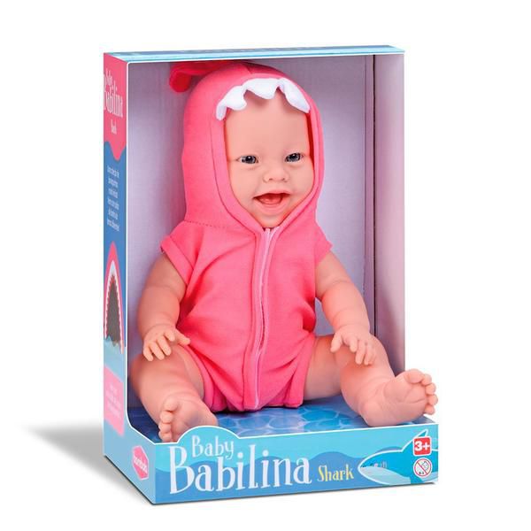 Uma bonequinha linda que vem com uma saída de banho de tubarãozinho! TODA EM VINIL