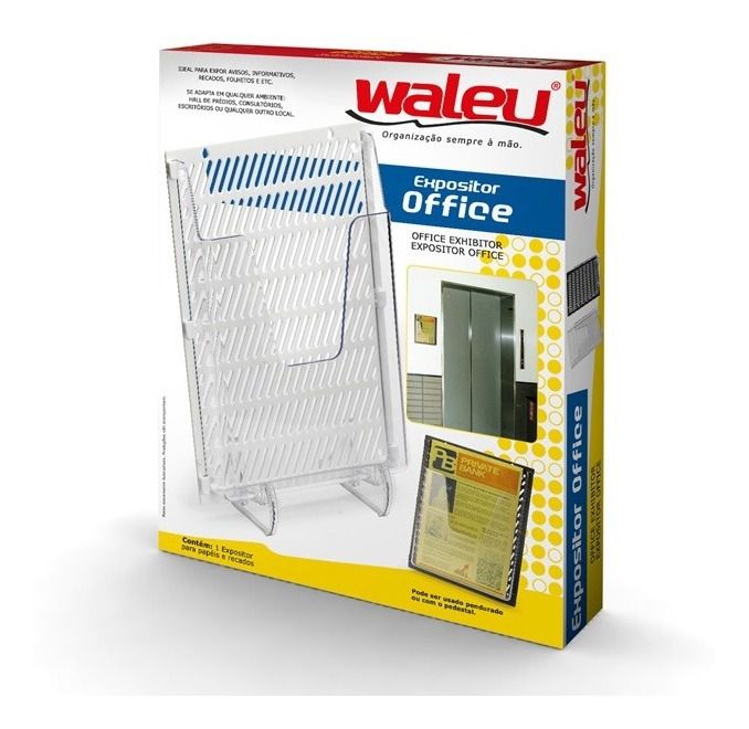 Ideal para expor avisos, informativos, recados, folhetos, etc. Pode ser usado pendurado ou com pedestal. Se adapta em qualquer ambiente: Hall de prédios, consultórios, escritórios ou qualquer outro local. Organização sempre à mão. Contém: 1 expositor para papéis e recados Medidas: 31,8 cm Alt. X 1,2 cm Larg. X 25,6 cm Compr. Marca: Waleu