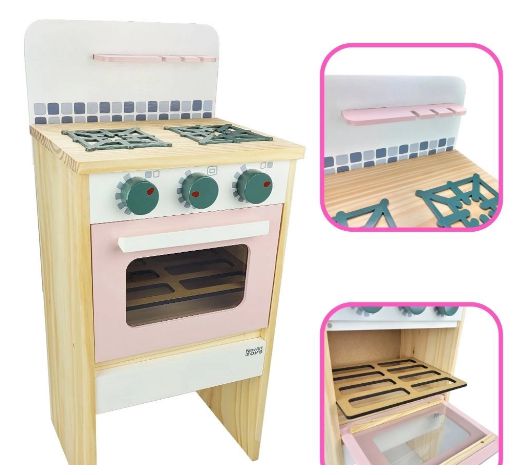 O Fogãozinho Infantil de Brinquedo modelo 367 da NewArt, é um lindo fogão de madeira com detalhes na cor rosa e que possui uma mini prateleira com suporte para acessórios para colocar por exemplo talheres de cozinha infantil, além de conter forno com tampa abre e fecha, tudo acondicionado em uma caixa de papelão.