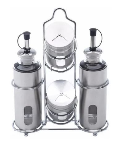 Jogo 4 Galheteiros Com Suporte Aço Inox - 25796 Marca: Bon Gourmet Material: Aço Inox / Vidro Conteúdo e Dimensões: - Porta Azeite/Vinagre: 4,5cm Diam. x 18cm Alt. - Capacidade: 160ml - Saleiro/Pimenteiro: 4,5cm Diam. x 8cm Alt. - Capacidade: 90ml - Suporte: 17cm Comp. x 7cm Larg. x 23cm Alt.