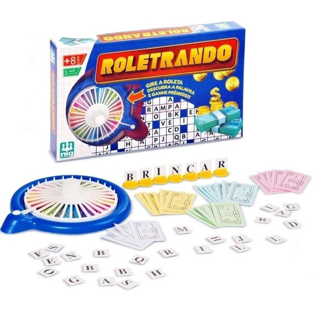 JOGO ROLETRANDO - NIG BRINQUEDOS Clássico jogo que consiste em adivinhar as letras que estão escondidas, para assim descobrir a palavra. A cada jogada a roleta deve ser girada determinado qual o valor da letra e aí tudo pode acontecer. Você pode ficar rico ou então PERDER TUDO. Boa sorte! Este é um jogo emocionante e seu objetivo é ter sorte na roleta e acertar a palavra ou frase! ESPECIFICAÇÕES: - Recomendado à partir de 8 anos - Dimensões da embalagem: (CLA) 45 X 6 X 25 cm - Contém: 20 bases plásticas, 01 roleta plástica, 02 cartelas de letras, Notas de diversos valores - Número de Jogadores: Para 2 ou mais - Marca: Nig - Referência: 1620 - Certificado de Segurança: INMETRO