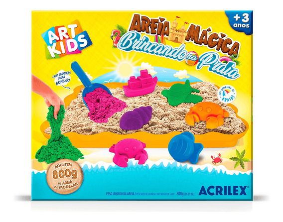 Kit com 4 potes de Areia Mágica, 9 moldes diversos, 2 pazinhas e uma bandeja para brincar. Além da diversão, a Areia Mágica promove uma incrível experiência sensorial, desenvolve a coordenação motora, habilidades manuais e a criatividade. A criança pode modelar, fazer esculturas,cortar, juntar, esticar e soltar a imaginação. Não molhar e não brincar com sua Areia Mágica com as mãos úmidas ou molhadas para evitar manchamentos.Usar somente sobre superfícies limpas.Para manter o aspecto do produto por mais tempo, armazene-o adequadamente dentro do pote bem tampado.Não Tóxico Como é uma Areia Cinética, ela não espalha como areia normal, então não faz muita bagunça.