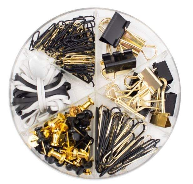 Aqui, beleza e organização andam juntos. Com o Kit Papelaria Bee Unique Time Lapse Preto e Dourado você reunirá itens necessários para sua organização pessoal, acadêmica e profissional, com qualidade e um toque de beleza. Contém: 40 alfinetes, 4 prendedores de papel 25 mm, 9 prendedores de papel 19 mm, 80 clips 28 mm, 27 clips 50 mm e 15 gramas de elástico.