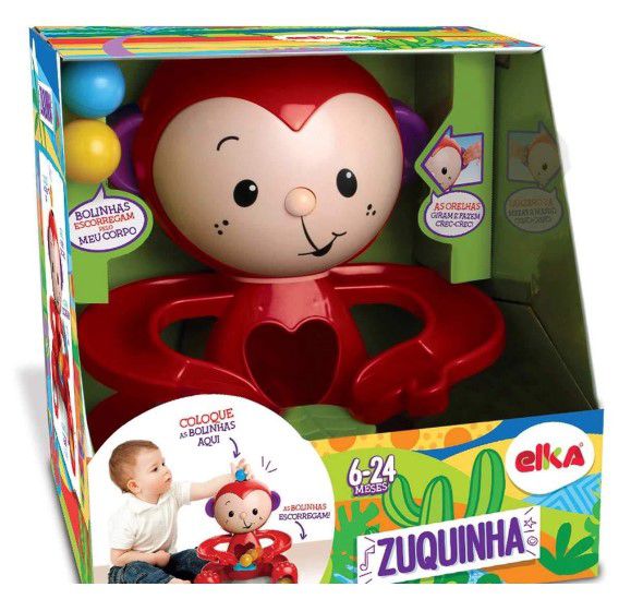 O macaquinho divertido e que será a alegria da garotada Com ele, as crianças poderão colocar as bolinhas na cabeça do Zuquinha e esperar por onde elas sairão. Além disso, o boneco fala quatro frases diferentes, basta aperta o nariz e aguardar ele dizer. E a diversão não para por aí. As orelhinhas giram e o bebê vai adorar