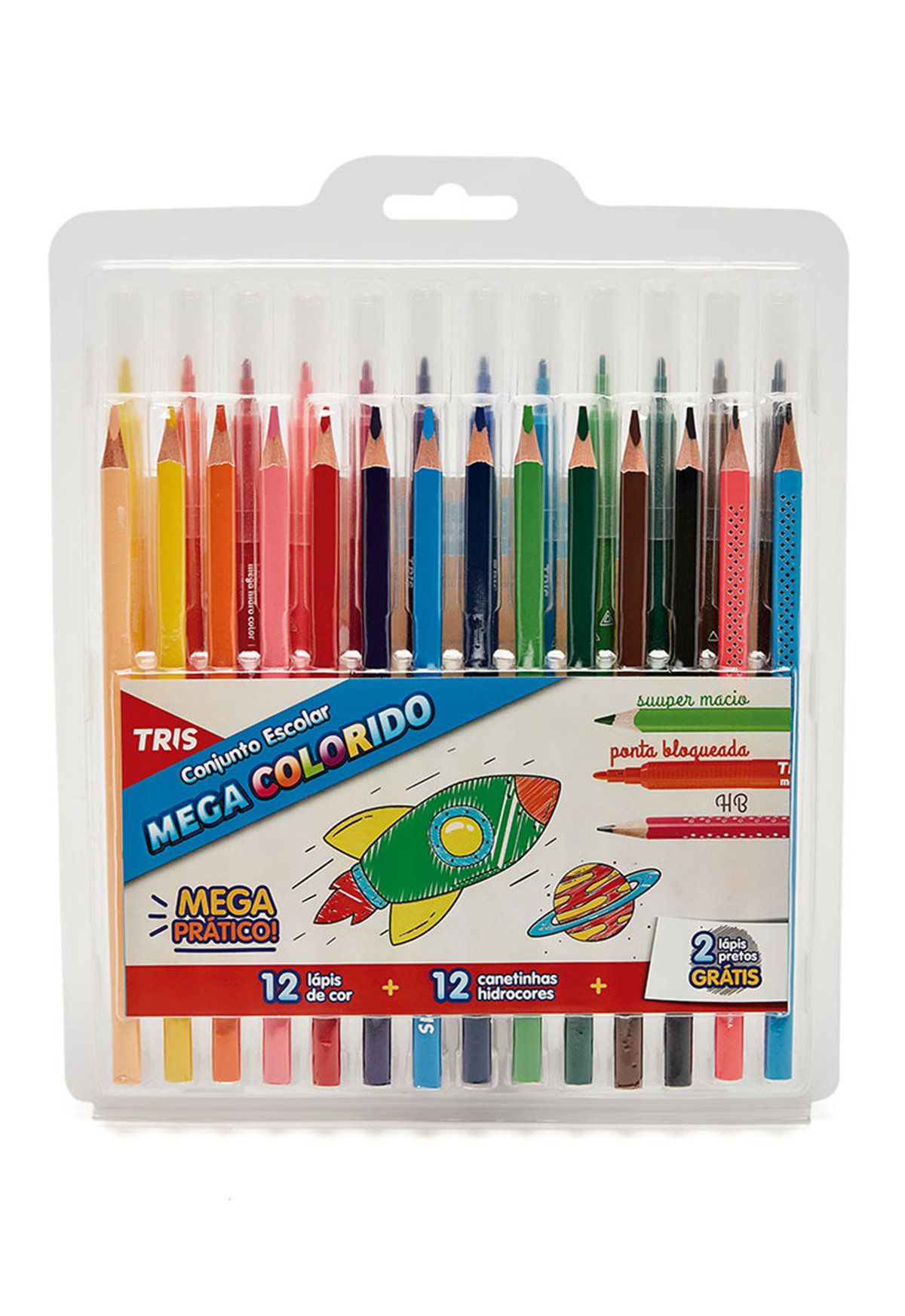 Um conjunto MEGA prático para um volta às aulas SUPER completo! Conta com 12 canetinhas hidrocores + 12 lápis de cor + 2 lápis pretos TRIO. Hidrocor de ponta bloqueada, lápis de cor de traço super macio e lápis preto de traço HB.