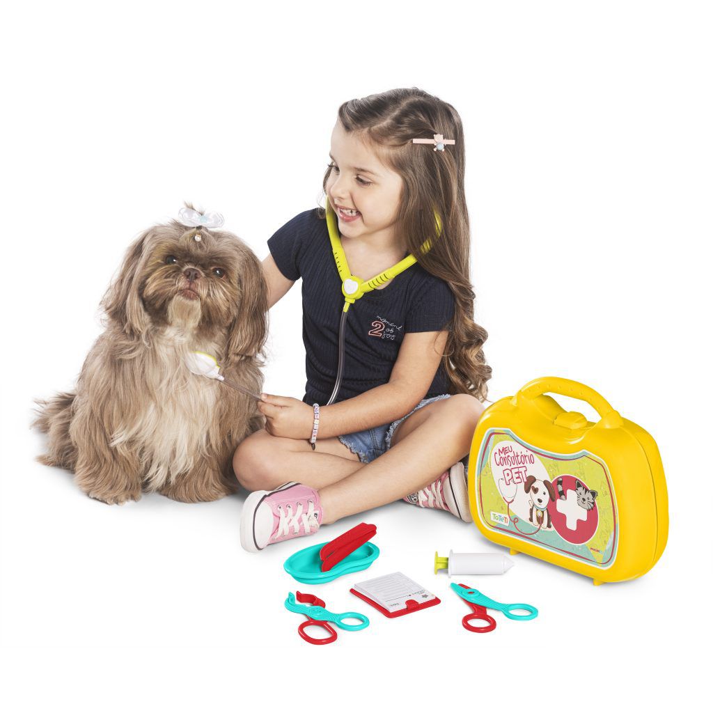 Pra cuidar do PET! A maleta do Meu Consultório Pet vem com diversos acessórios, idênticos ao que um veterinário(a) de verdade usa para cuidar dos pets. Tudo fica organizado dentro da prática maleta, que contém vários acessórios para brincar, entre eles tem estetoscópio, a seringa e até um mini prontuário. Ao total são 07 acessórios para se divertir! 1 Maleta 1 Mini Prancheta com bloco 1 Estetoscópio 1 Pinça Anatômica Curva 1 Pinça Backhaus 1 Seringa 1 Tesoura 1 Cuba Habilidades desenvolvidas: Adaptação social e interação Aprendizado pela imitação Conhecimento Geral Curiosidade e descoberta Expressão e comunicação Imaginação e criatividade
