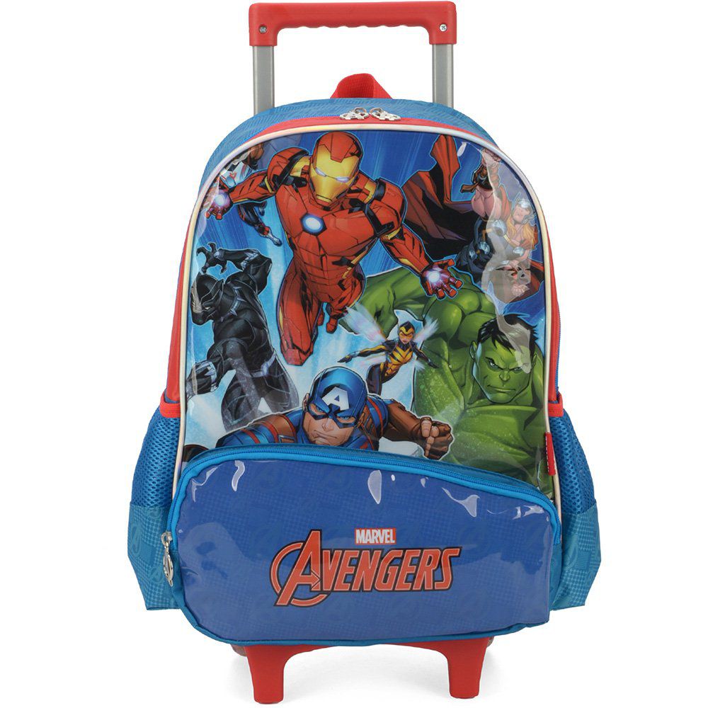 MOCHILA AVENGERS COM RODA 16 POLEGADA COM BOLSO FRONTAL E DOIS BOLSOS LATERAIS PARA GARRAFINHA,POSSUI ALÇA NAS COSTAS.