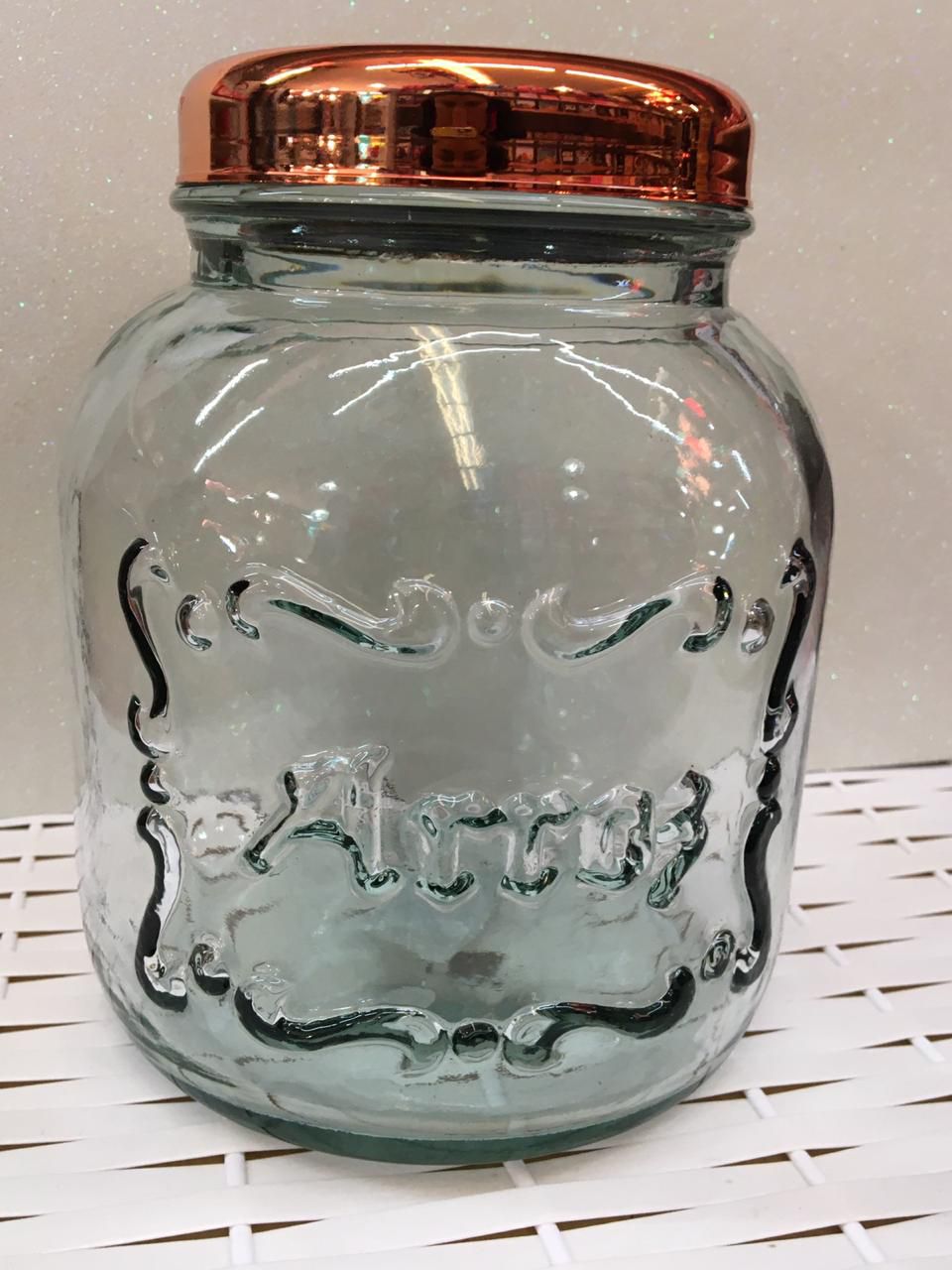 Pote mantimento em vidro 2,5l. Escrito arroz.