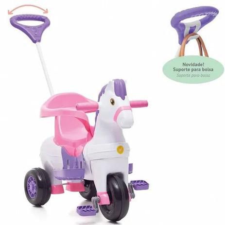 Imita som de cavalo!O cavalinho é um brinquedo 2 em 1, acompanha as fases de crescimento da criança com conforto e segurança.Na primeira fase, o apoio de pés mantém as perninhas do bebê apoiadas e, a estabilidade do corpo é garantida pelo cercado de proteção, também removível. Já na fase mais independente do bebê, retira-se o apoio de pés e cercado de proteção para a diversão do passeio pedal. Pensando nessa independência para a diversão do pedal, o Potó foi projetado com roda dianteira acompanhada de borracha para evitar derrapar.