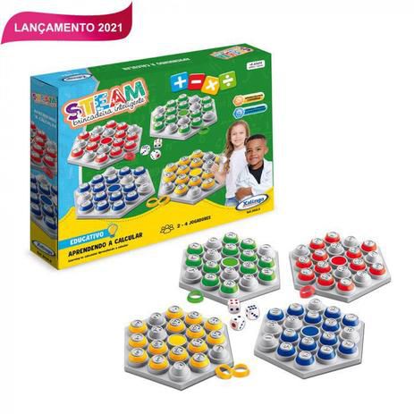 Com o jogo educativo da linha Steam Aprendendo a Calcular da Xalingo Brinquedos as crianças irão aprender cálculos matemáticos e estratégias. Contém 79 peças: 4 tabuleiros plásticos, com 18 números cada, marcados de 1 a 18, 72 anéis de plástico em 4 cores (18 anéis de cada cor), 3 dados de jogo. O objetivo do jogo é completar os 18 números contidos no tabuleiro. A criança pode completar utilizando os números sorteados nos dados ou realizando operações matemáticas. Estimula a memória e o raciocínio lógico. Indicado para crianças a partir dos 8 anos de idade.