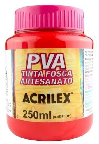Tinta Para Artesanato PVA Acrilex 250ml Vermelho Fogo CARACTERÍSTICAS A base de Látex P.V.A. Secagem rápida. Acabamento fosco. Pronta para uso MODO DE USAR Pode ser aplicada com pincel, esponja ou rolinho de espuma. AUXILIARES Diluente: água. Gel para Matizar, Médium Acrílico, Verniz Acrílico, Lacas, Acrilfix e Base Acrílica para Artesanato.